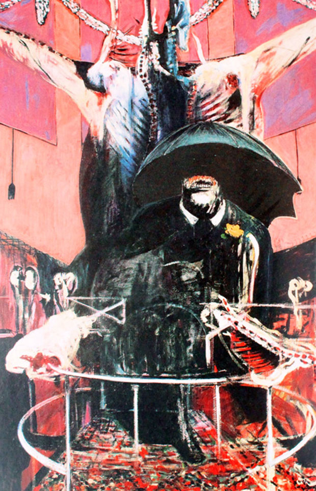Pintura, 1946, es consecuencia del escarnio que Bacon viene sufriendo por parte de la sociedad. El aspecto monstruoso de la figura central muestra la imagen que tiene de los causantes de su dolor que llevan a sus espaldas los muertos que han causado representados por la res muerta y abierta en canal.