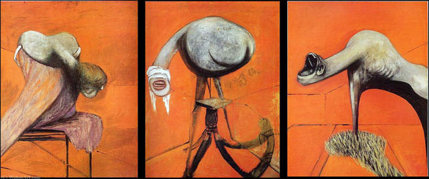 Tres estudios para figuras en la base de una crucifixión, 1944. Esta obra expresa un profundo dolor. Esta obra no muestra ninguna violencia sino sus efectos emocionales. Esta obra no es imposible de interpretar, como se ha llegado a decir. En este cuadro se muestra el dolor del autor a través de las figuras que en él aparecen. El dolor, que causa daño en el alma, el dolor que, por experiencia propia, sabemos que destroza el alma y por lo tanto la transforma, la deforma, le muestra metafóricamente como transformación del cuerpo de las figuras que sufren la pena. La transformación de los cuerpos en formas y figuras amorfas no significa otra cosa que el dolor primordial de la vida que se expresa en toda forma animal con capacidad para sentir. El animal representa las pasiones más allá de toda racionalización. En la obra no aparece representada ninguna violencia, en el cuadro se representan los efectos emocionales de la violencia que se ha sufrido.