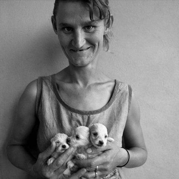 Platteland - Wife of abattoir worker holding three puppies Orange Free State, 1994