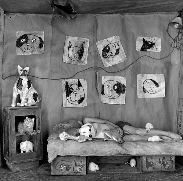 La preocupación de Ballen por expresar sus opiniones sobre los seres humanos, especialmente, de los marginados, le llevó, a diferencia de la mayoría de fotógrafos, pero no de todos, a escenificar las situaciones que quería reflejar en sus fotografías, controlando todos los aspectos de la imagen que producirá: los cierres, los ambientes, los personajes -ya sean humanos o animales-, los objetos, los dibujos, las grafías… lo cual le convirtió, no en artista de la fotografía, que entiendo que ya lo era, sino en otro tipo de artista.